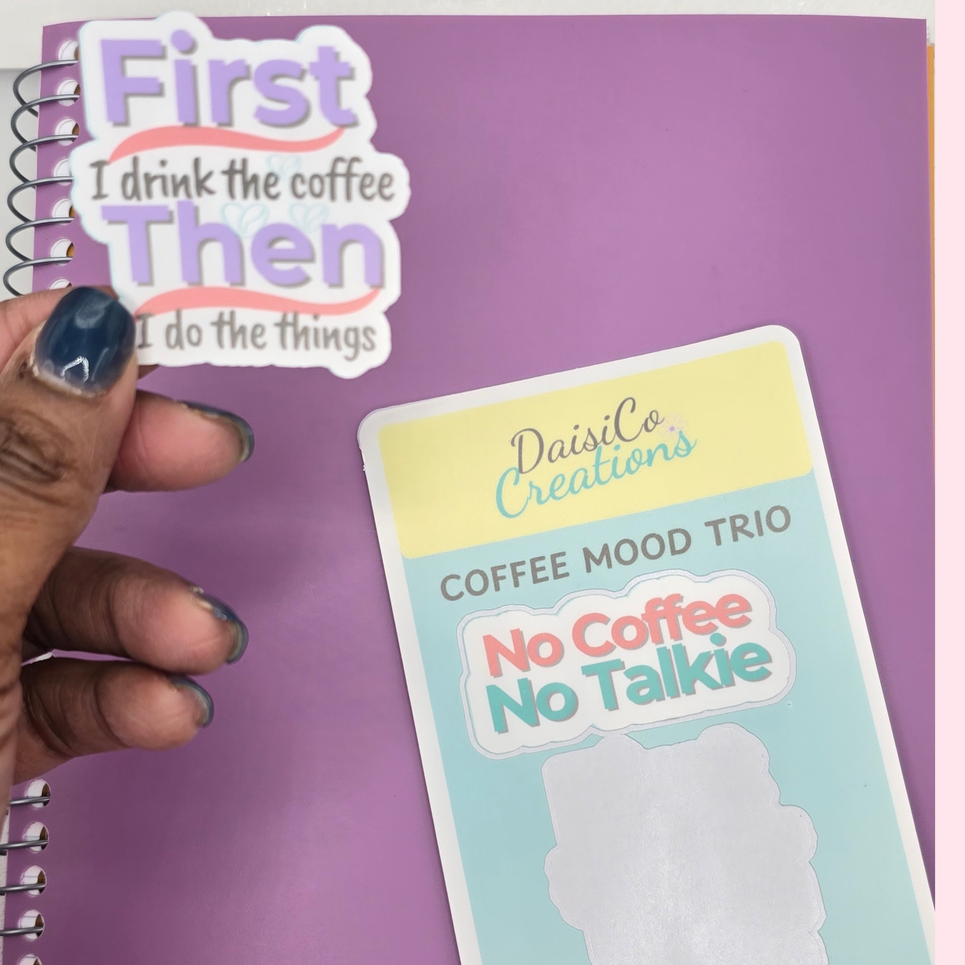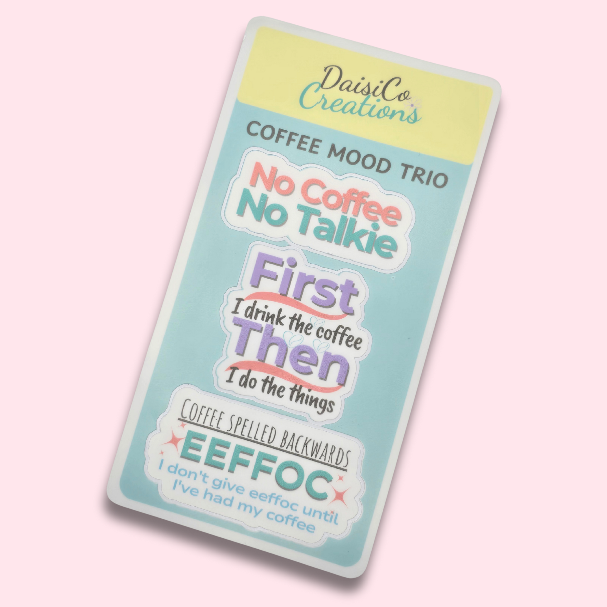 Running on caffeine and chaos? This Coffee Mood Trio sticker sheet packs three funny, relatable coffee quotes into one waterproof sticker set — perfect for laptops, water bottles, planners, and office desks.